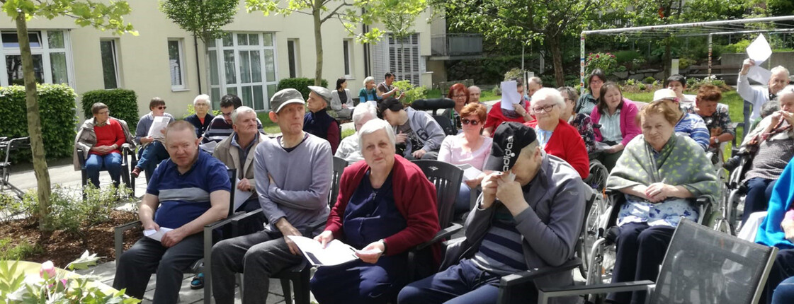 Herrlicher Sonnenschein begleitete die Maiandacht, die am 18. Mai 2019 von Caritas-Mitarbeiterin Elisabeth Ratzenböck für die BewohnerInnen von St. Bernhard und invita im wunderschönen, blühenden Innenhof gestaltet wurde. Mit Musik, Gebeten und stimmungsvollen Texten wurde die Maiandacht gemeinsam gefeiert.