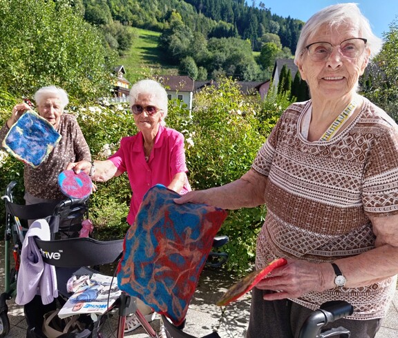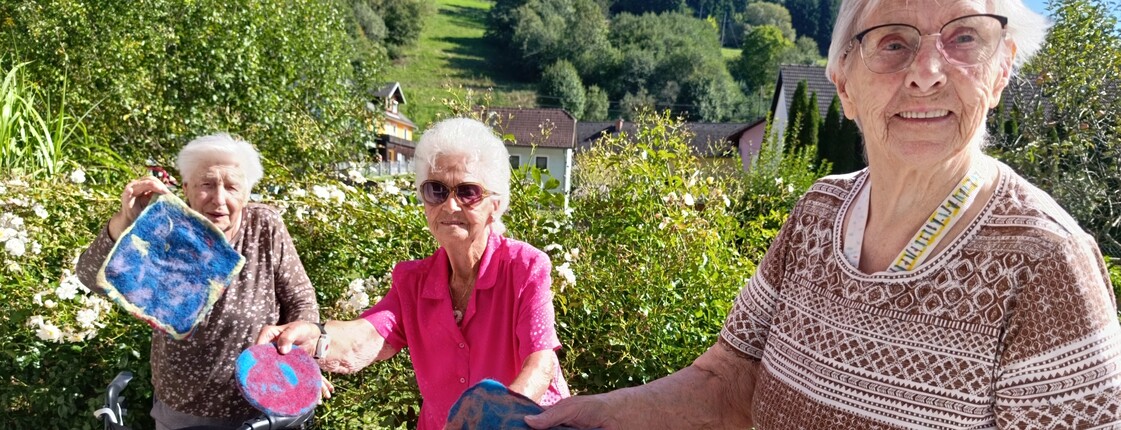 Demenz – die sogenannte Krankheit des Vergessens – gilt als die häufigste Ursache von Pflegebedürftigkeit. Sie verändert das Leben der Betroffenen und ihrer Familien. Für den Weltalzheimertag wurde in unserem Pflegewohnhaus „Haus Anna“ in Eberstein viel vorbereitet. Bereits im Vorfeld hat der engagierte Fachsozialbetreuer Dominik Zwatz mit den Bewohner*innen viel Zeit und Liebe investiert, um an diesem speziellen Tag im Nassfilzverfahren Untersetzer für Vasen und Gläser oder auch Sitzunterlagen für den persönlichen Gebrauch anzufertigen. Gemäß dem Motto „Erinnern beugt Vergessen vor“ gestalteten Bewohner*innen am 18. September 2025 einzigartige kleine Kunstwerke unter fachkundiger Anleitung von Zwatz.