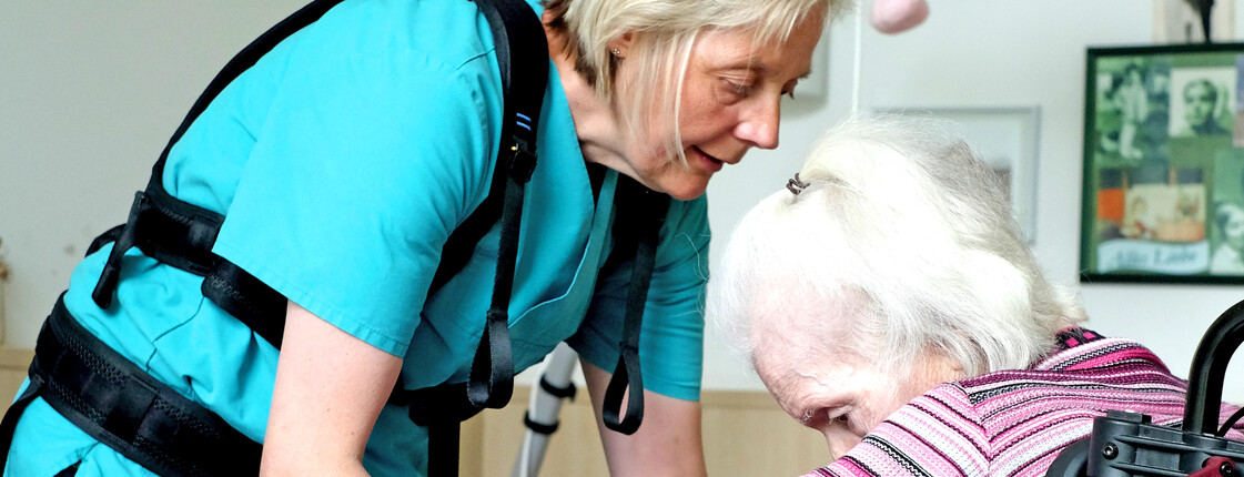 Andrea Witzersdorfer arbeitet seit 13 Jahren als Fach-Sozialbetreuerin im Caritas- Seniorenwohnhaus St. Anna: „Jeder, der in der Pflege arbeitet, kennt Rückenschmerzen“, erzählt die Fachkraft. Mit dem Liftsuit kann sie die Bewohner*innen mit deutlich weniger Kraftanstrengung z.B. aus dem Rollstuhl ins Bett transferieren. „Das Exoskelett stört überhaupt nicht, es unterstützt mich und gibt mir Sicherheit“, betont die Caritas-Mitarbeiterin. „Ich arbeite wirklich sehr gerne damit, weil es entlastend ist. Zudem ist es sehr rasch an- und ausgezogen.“ Das Gurtsystem wird ähnlich wie ein Rucksack angezogen. Vier Schnallen werden geschlossen, das System wird festgezogen – und schon unterstützt es beim Heben.